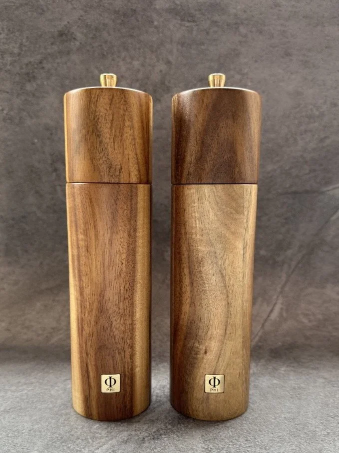 Enhance your kitchen and table with our superior mill. Elevate every dish with the elegance and quality you deserve. This acacia salt & pepper mill, with its satin finish and gold accents, is both elegant and practical. Designed for gourmets, it ensures you’ll never forget this accessories on a beautifully set table for family and precious guests. Always attentive to refined details in your home. this is your identity, details.
